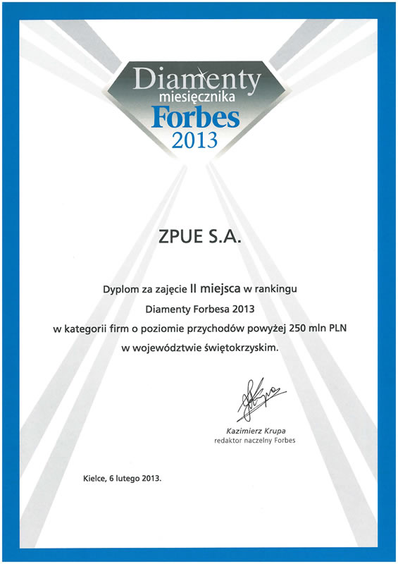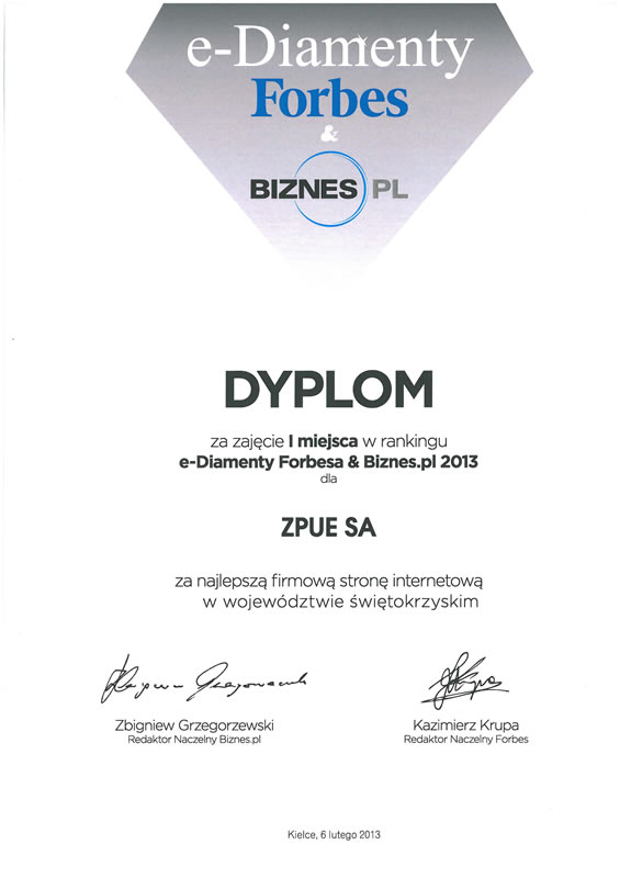 Marcin Skoczek Firma ZPUE S.A. otrzymała Diament Forbesa 2013, zajmując II miejsce na liście najbardziej wartościowych spółek województwa świętokrzyskiego. Imponującym wyróżnieniem jest e-Diament Forbes&Biznes.pl oraz I miejsce w kategorii na najlepszą stronę korporacyjną. Diamenty Forbesa zostały rozdane podczas uroczystej gali, która odbyła się w środę, 6-go lutego w Kielcach. Amerykański dwutygodnik, wydawany w Polsce od 2004 roku we współpracy z wywiadownią gospodarczą BISNODE Polska, (dawniej Dun&Bradstreet), opracował ranking firm najszybciej zwiększających swoją wartość. W tegorocznym zestawieniu pod uwagę zostały wzięte wyniki finansowe osiągnięte w latach 2009,2010 i 2011. „Na świętokrzyskiej gali wręczono również e-Diament Forbes&Biznes.pl, nagrodę przyznawaną przedsiębiorcom za najlepsze strony internetowe. W tym roku bezkonkurencyjna okazała się firma ZPUE S.A., tym samym otrzymała ona 10 tys. zł na kampanię reklamową w serwisie Biznes.pl." /źródło portal Biznes.pl/ Taką informację i relację filmową z gali, w której wzięli udział Andrzej Grzybek, prezes zarządu ZPUE S.A. oraz Iwona Dobosz, członek zarządu Koronei możecie obejrzeć tutaj od 01:58 minuty: Źródło: http://biznes.pl/wiadomosci/raporty/swietokrzyskie-czolowka-nie-zwalnia-tempa,5414765,1,5396046,443,news-detal.html Na zdjęciu: Adrian, najmłodszy grafik Biura Promocji i Reklamy ZPUE, który razem z koleżankami i kolegami z działu tworzy nasze strony internetowe. Poprzednia strona: Ponad 400 naszych rozdzielnic zasili największy port kontenerowy w Europie Poprzednia Następna strona: Stacje transformatorowe ZPUE S.A. w Grecji Następna